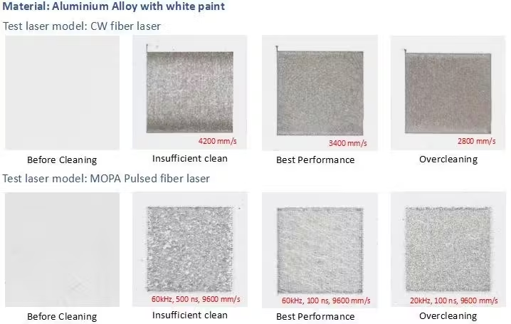 我们使用两种型号的激光器来清洁不同种类的材料:一种是带有白色油漆的铝合金(约 20 μm),另一种是带有白色油漆的碳钢(约 40 μm)。通过调整脉冲宽度(100 ns、200 ns 和 500 ns)、频率 (20-60 kHz) 和扫描速度 (1500-9600 mm/s) 来实现清洁性能。图 1 和图 2 显示了表中详述的测试激光器的清洁性能。
